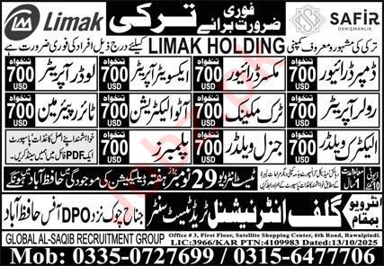Vacant posts including Electric Welder, Roller Operator, Loader Operator, Dumper Driver, General Welder, Mixer Driver, Auto Electrician, Tire Repair Man, Excavator Operator, Truck Mechanic and Plumber are announced in Gulf International Trade Test Center Istanbul, istanbul Turkey as per 17 November 2025 advertisement in daily Express Newspaper. Intermediate, Middle and Matric etc. educational qualification will be preferred.