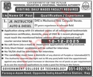 Government College of Technology Sadiqa Abad Rawalpindi, rawalpindi Punjab Pakistan invites applications from eligible candidates for the post of jr instructor auto diesel as per advertisement of December 1, 2025 published in daily Jang Newspaper. Educational qualifications required DAE etc.
