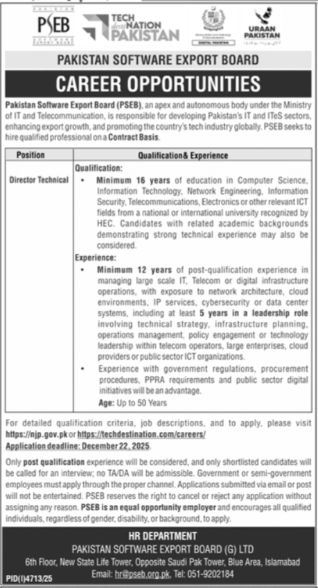 Vacancies in Pakistan Software Export Board PSEB Advertisement December 2025
