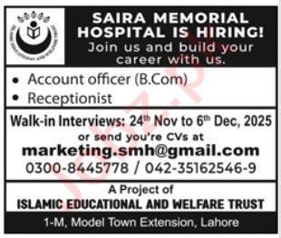 Saira Memorial Hospital Model Town Extension Lahore, lahore Punjab Pakistan invites applications from eligible candidates for the post of account officer and receptionist as per advertisement of November 23, 2025 published in daily Jang Newspaper. Candidates with Bachelor, Master and B.com etc. educational background will be preferred.