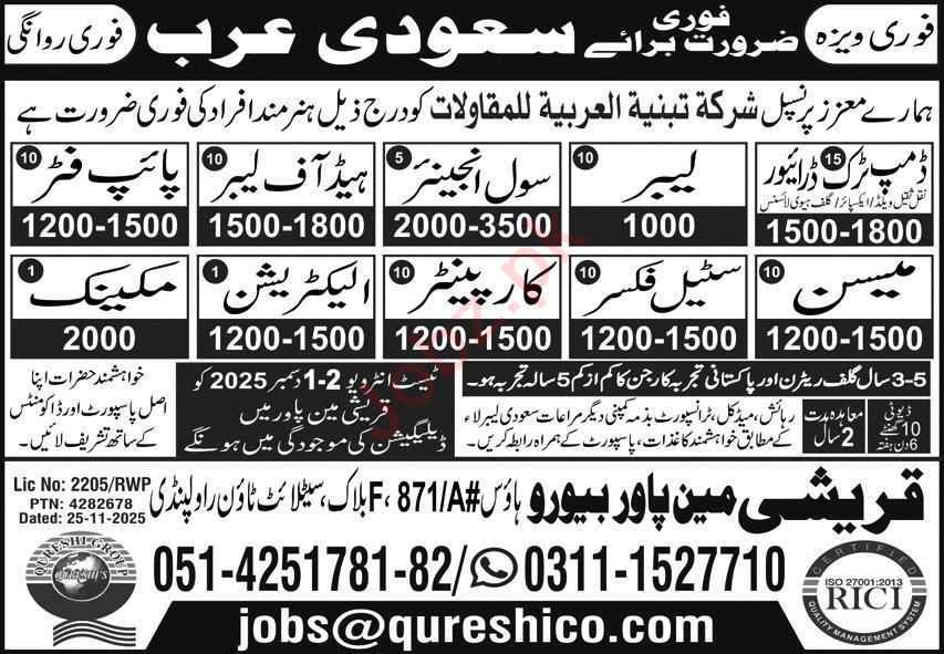 Vacant posts including pipe fitter, steel fixer, carpenter, head of labor, labor, mason, electrician, dumper truck driver, mechanic and civil engineer are announced in Qureshi Manpower Bureau Makkah, makkah Saudi Arabia as per 30 November 2025 advertisement in daily Express Newspaper. Candidates with Matric, Middle, Primary, Intermediate and DAE etc. educational background will be preferred.