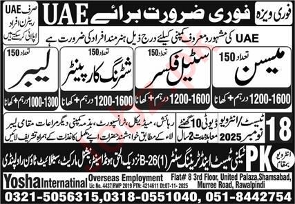 Yousha International Overseas Employment Corporation jobs advertisement dated about 17 November 2025 in daily Express Newspaper invites application for the vacant post of labor, shuttering carpenter, steel fixer and mason in UAE, uae UAE. Educational qualifications required Intermediate, Middle and Matric etc.