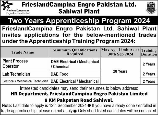 Friesland Campina Sahiwal, sahiwal Punjab Pakistan invites applications from eligible candidates for the post of plant process operator apprentice, electrical apprentice, lab technician apprentice and mechanical technician apprentice as per advertisement of September 6, 2024 published in daily Express Newspaper. Persons with DAE etc. education can apply.