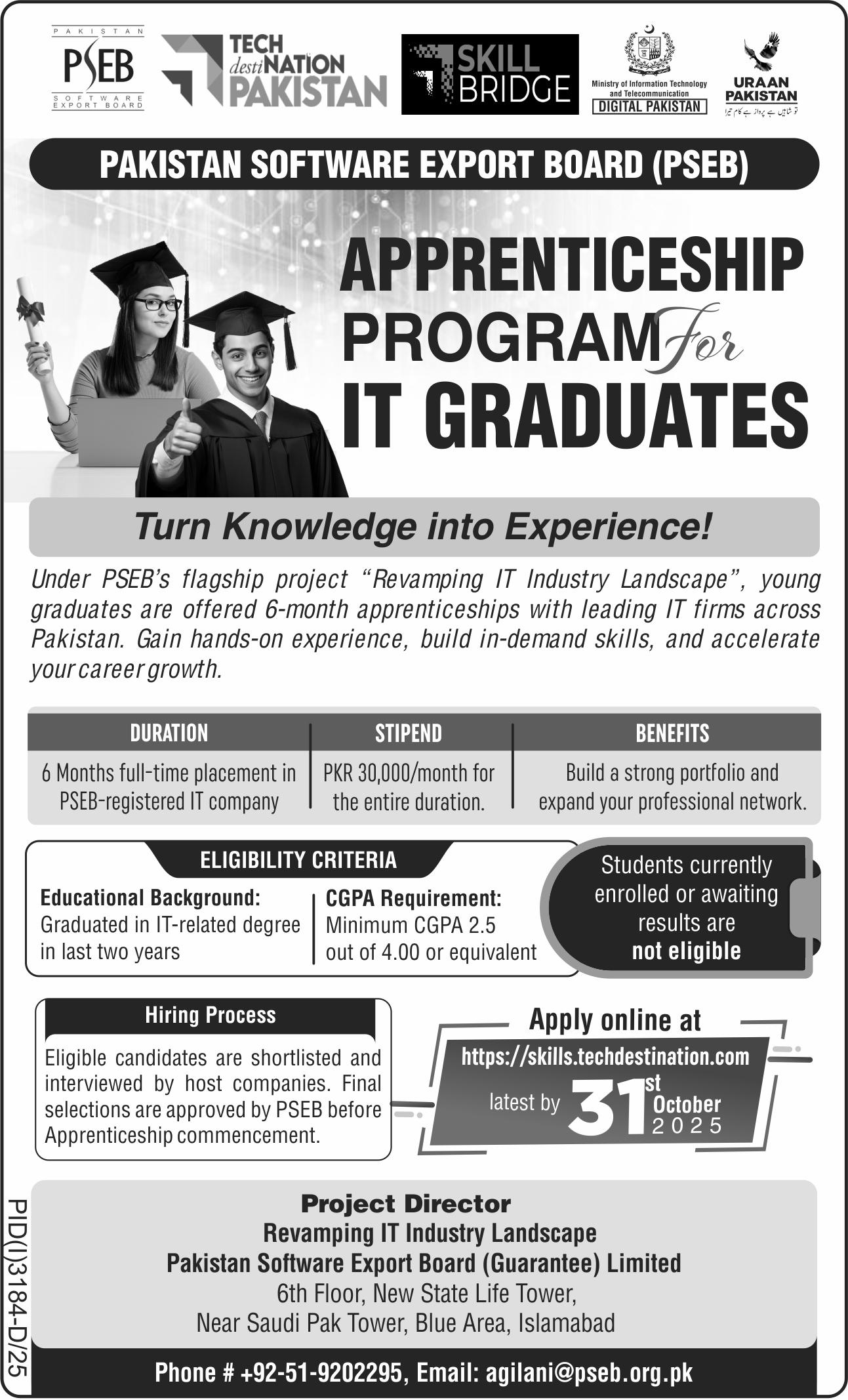 Pakistan Software Export Board PSEB invites applications for job positions advertised in daily Other dated 18 October 2025 for following vacancies in Blue Area Islamabad, islamabad Islamabad Pakistan.