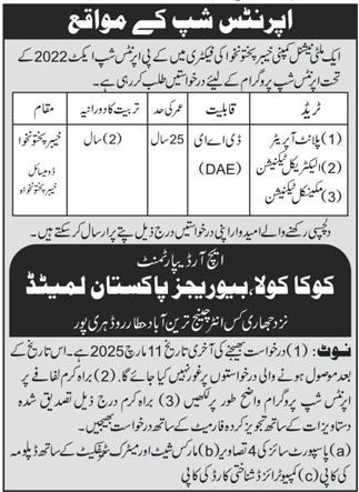 Coca Cola Company is looking for candidates for following posts as per job advertisement published in daily Aaj Newspaper of February 23, 2025 for location Hattar Haripur, haripur Khyber Pakhtunkhwa KPK Pakistan: