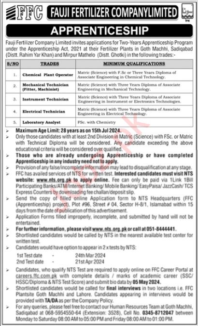 Fauji Fertilizer Company Limited latest Private Management jobs and others can be applied till 5 May 2024 or as per closing date in newspaper ad. Read complete ad online via NTS to know how to apply on latest Fauji Fertilizer Company Limited job opportunities.