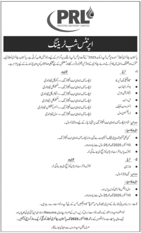 Pakistan Refinery Limited Karachi, karachi Sindh Pakistan invites applications from eligible candidates for the post of instrument mechanic, millwright, apprenticeship training program, boiler attendant, fireman, manufacturing operative, electrician general and draftsman civil as per advertisement of September 28, 2025 published in daily Jang Newspaper. Preferred Education is DAE and Matric etc.
