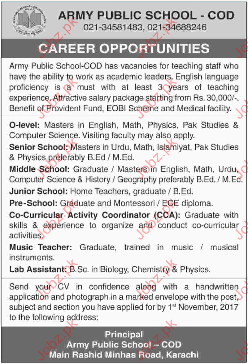 Latest Army Public School APS Teaching Posts Karachi 2025