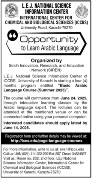 International Center For Chemical & Biological Sciences has announced admissions 2025 for Arabic Language Course . Students can enroll for admissions in International Center For Chemical & Biological Sciences Karachi Sindh Pakistan for academic year 2025 to continue campus based or online education in Engineering University. Eligible candidates for admissions in can apply as per Government institute criteria and before closing date after reading advertisement online. Read newspaper ad for exact details.