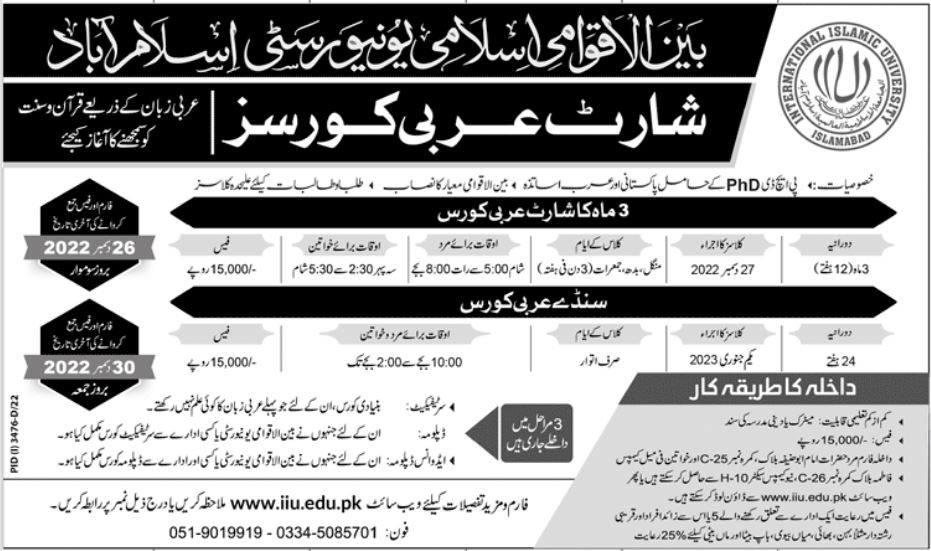 International Islamic University Islamabad IIUI has announced admissions 2022 for Arabic Course, Sunday Arabic Course. Students who want to take admissions in International Islamic University Islamabad IIUI Islamabad Islamabad Pakistan for academic year 2022 to continue education in Language University can apply. Students who want to enroll for academic session 2022 in Course qualification and admission criteria for Private institute can apply till last date 26 December 2022. Read newspaper ad for exact details.