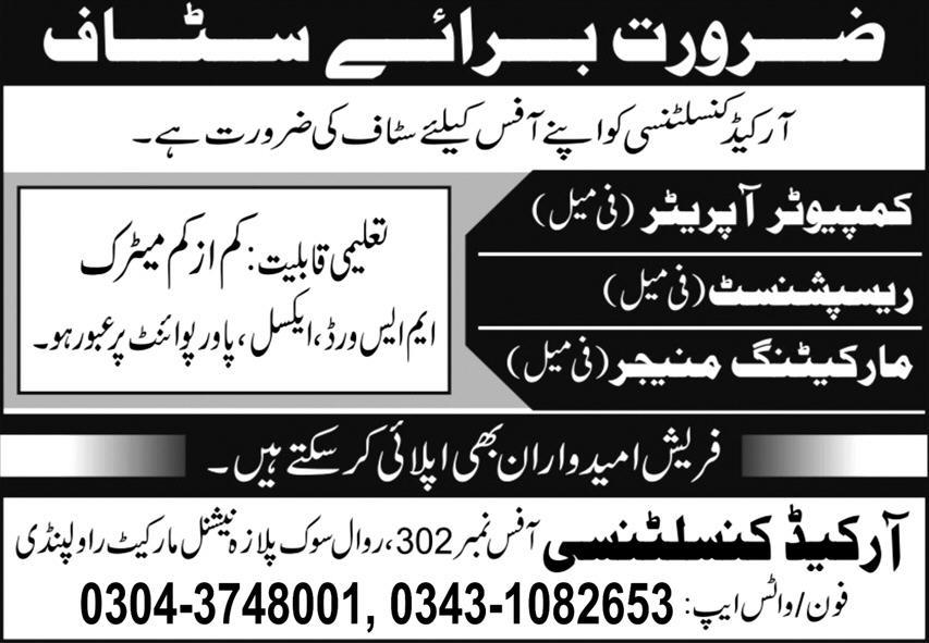 Arcade Consultancy Rawalpindi, rawalpindi Punjab Pakistan invites applications from eligible candidates for the post of receptionist, computer operator and marketing manager as per advertisement of January 8, 2025 published in daily Express Newspaper. Preferred Education is Intermediate and Matric etc.