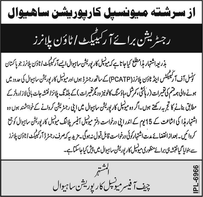 Vacant posts including town planner and architect are announced in Municipal Corporation Sahiwal, sahiwal Punjab Pakistan as per 27 July 2024 advertisement in daily Roznama 92 News Newspaper. Educational qualifications required Master and Bachelor etc.