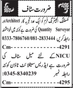 Vacant posts including quantity surveyor, nicu staff and architect are announced in Private Company Quetta, quetta Balochistan Pakistan as per 19 July 2022 advertisement in daily Jang Newspaper. Candidates with Bachelor, Intermediate, Middle and Matric etc. educational background will be preferred.