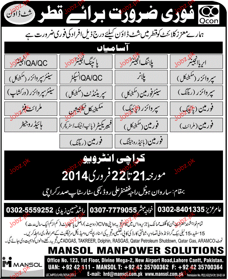 Area Engineers, Planning Engineers, Supervisors Wanted