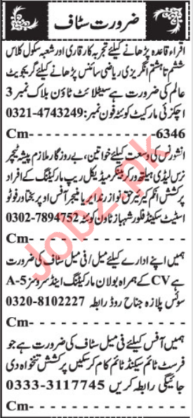 Area Manager, Marketing Officer, HR Officer, Supervisor, Assistant Supervisor, Account Manager, Office Assistant, Salesman, Marketing Staff, Teacher, English Teacher, Chemistry Teacher, Physics Teacher, Coordinator, Biology Teacher, Maths Teacher, Sales Staff, Computer Operator, Sales Manager, Sales Officer seeks in well developed companies.