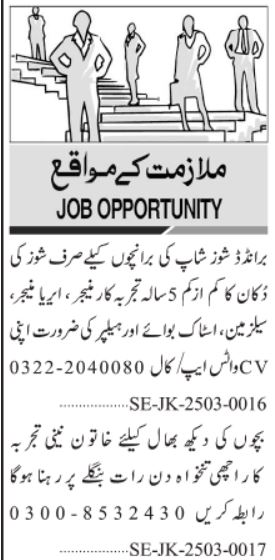 Private Company jobs advertisement dated about 5 March 2025 in daily Jang Newspaper invites application for the vacant post of area manager, salesman, helper, nanny, stock boy, manager and maid in Karachi, karachi Sindh Pakistan. Candidates with Bachelor, Intermediate, Matric, BA and Middle etc. educational background will be preferred.