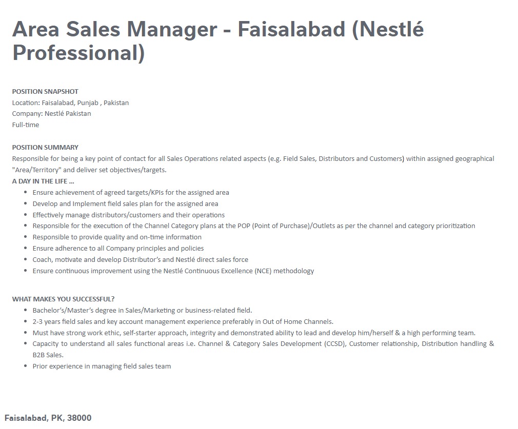 Original Source: https://jobdetails.nestle.com/job/Faisalabad-Area-Sales-Manager-Faisalabad-%28Nestl%C3%A9-Professional%29-38000/1024971601/?feedId=256801&utm_source=NestleCareers