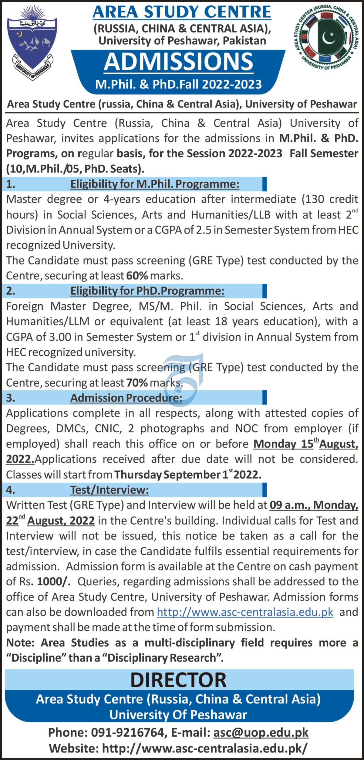 Area Study Centre University of Peshawar UoP MPhil & PhD Programs admissions 2022 has been started. Students who want to take admissions in Area Study Centre Peshawar Khyber Pakhtunkhwa KPK Pakistan for academic year 2022 to continue education in Science M. Phil can apply. Eligible students for fulfilling criteria for admissions in Phd and Mphil can enroll as per Government admission policy 2022 till closing date 22 August 2022. Read newspaper ad for exact details.