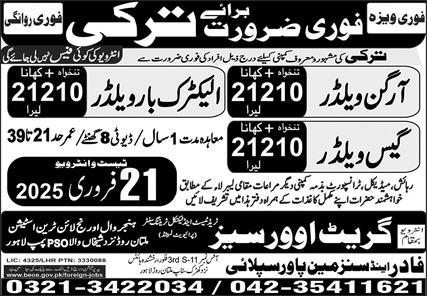 Father & Sons Manpower Supply jobs advertisement dated about 9 February 2025 in daily Express Newspaper invites application for the vacant post of gas welder, argon welder and electric bar welder in Ankara, ankara Turkey. Preferred Education is Middle etc.