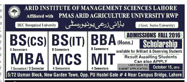 Arid Agriculture University Admission in BS, MBA and BBA in Rawalpindi. Read newspaper ad for exact details.
