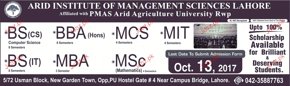 ARID Institute of Management Science Admission in BS Cs, BBA Hons 8 Semesters, MCs 4 Semesters, MIT 4 Semesters, BS IT 8Semesters and MSc 6 Semesters in Rawalpindi. Read newspaper ad for exact details.