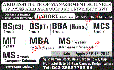 Arid Institute of Management Sciences Admission in BS, BBA, MS, MIT and MCS in lahore. Read newspaper ad for exact details.