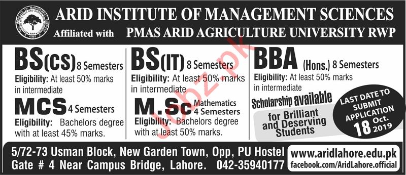 Arid Institute of Management Sciences is offering admissions in BS Computer Science, BS Information Technology, BBA, MCS, M.Sc Mathematics in Lahore. Arid Institute of Management Sciences is affiliated with PMAS Arid Agriculture University Rawalpindi. Read newspaper ad for exact details.