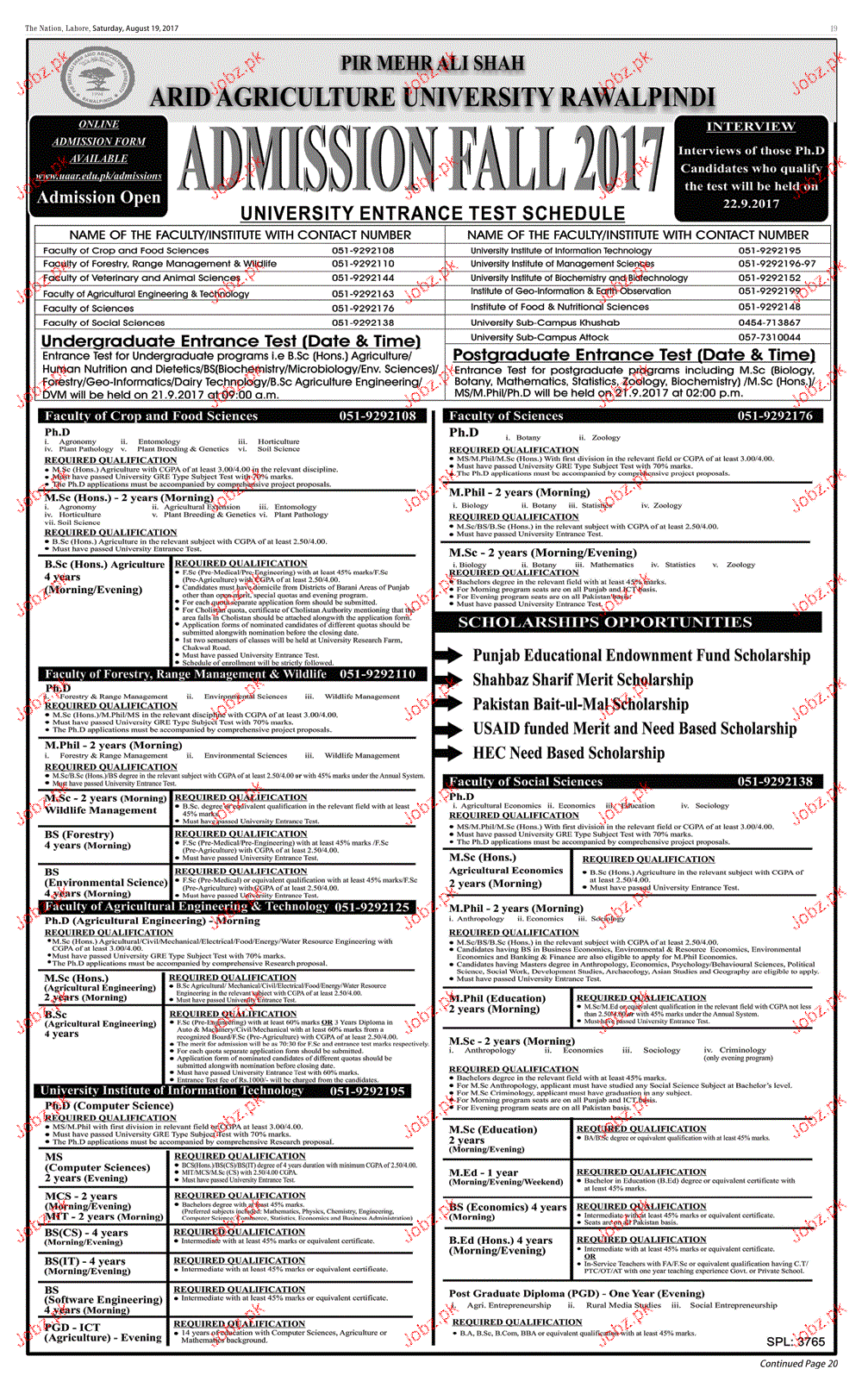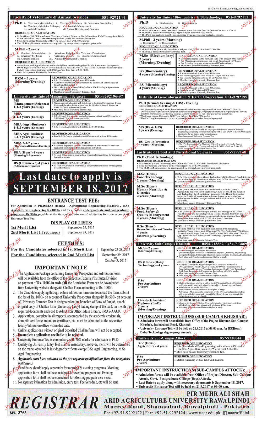 Arif Agriculture University Rawalpindi Admission in Undergraduate Programs in Rawalpindi. Read newspaper ad for exact details.