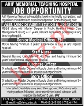 Arif Memorial Teaching Hospital AMTH Lahore, Pakistan is seeking candidates for the posts of Assistant Director, Assistant Director Administration, Assistant Director Operations, Medical Officer, Senior Medical Officer, ENT Medical Officer, Staff Nurse, Nurse, Purchase Officer, Store Officer.