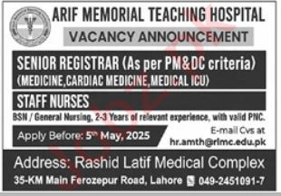 Arif Memorial Teaching Hospital AMTH is looking for candidates for following posts as per job advertisement published in daily Jang Newspaper of April 20, 2025 for location Ferozepur Road Lahore, lahore Punjab Pakistan: