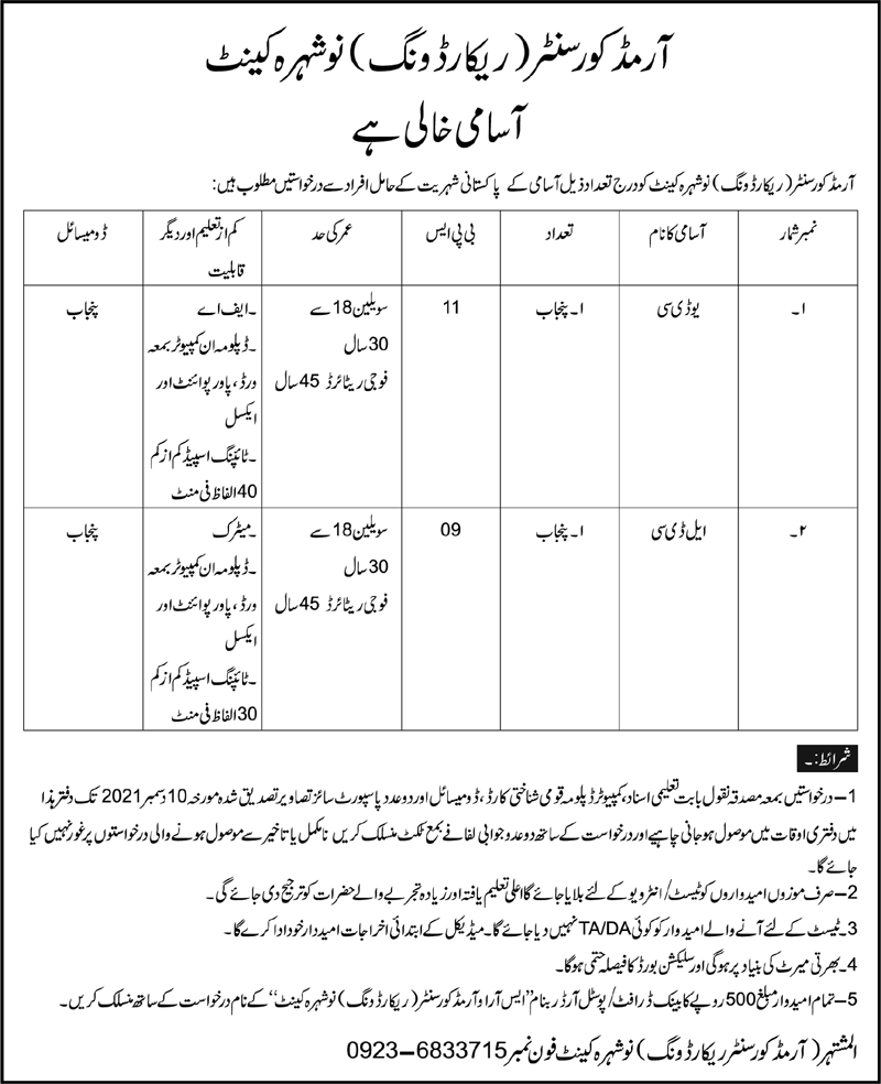 Armed Core Center Recording Wing Nowshera Jobs 2021