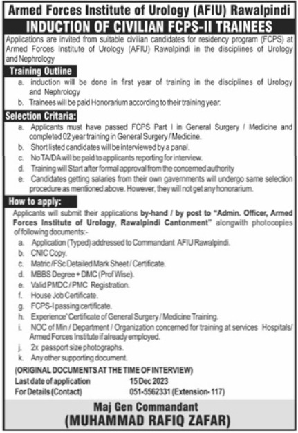 Apply at Armed Forces Institute of Urology AFIU latest Government jobs Internships in Medical and departments before closing date which is around December 15, 2023 or as per closing date in newspaper ad. Read complete ad online to know how to apply on latest Armed Forces Institute of Urology AFIU job opportunities.