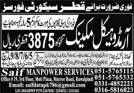 Saif Manpower Services Doha, doha Qatar invites applications from eligible candidates for the post of armed vehicle mechanic as per advertisement of March 6, 2024 published in daily Express Newspaper. Middle etc. educational qualification will be preferred.
