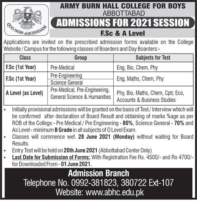 Army Burn Hall College for Boys invited applications for admissions in Intermediate, FSc Pre Medical, FSc Pre Engineering, FSc Science General in Abbottabad KPK 2021. Read newspaper ad for exact details.