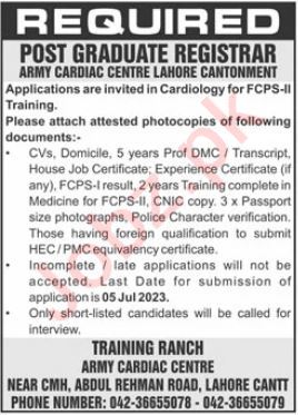 Vacant posts including post graduate registrar are announced in Army Cardiac Center Lahore, lahore Punjab Pakistan as per 25 June 2023 advertisement in daily Jang Newspaper. Candidates with MBBS and Master etc. educational background will be preferred.