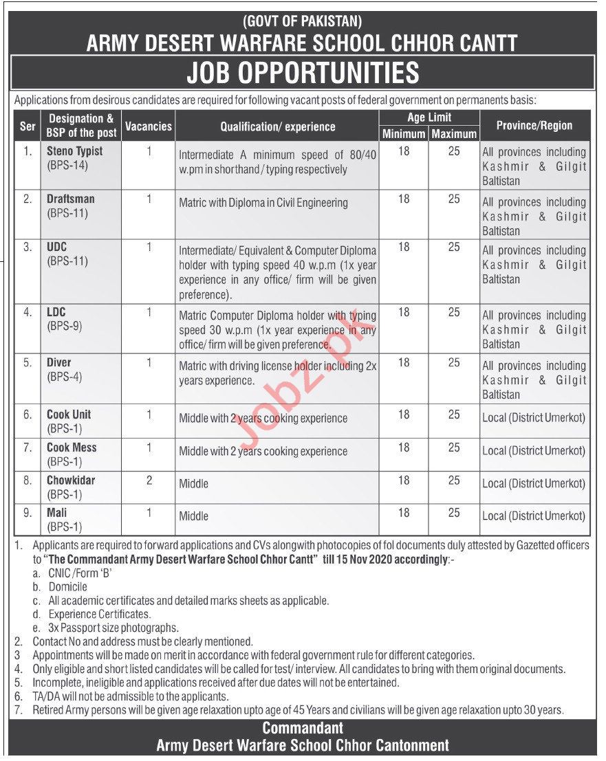 Army Desert Warfare School Chhor Cantt, Pakistan Army, Government of Pakistan is seeking candidates for the posts of Steno Typist, Draftsman, UDC, Upper Division Clerk, Clerk, LDC, Lower Division Clerk, Driver, LTV Driver, HTV Driver, Cook, Cook Unit, Cook Mess, Chowkidar, Watchman, Mali, Gardener.