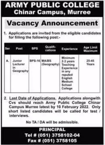 Army Public College Murree Punjab Pakistan invites applications from eligible candidates for the post of Lecturer and Lecturer Geography as per advertisement of January 30, 2022 published in daily Dunya Newspaper. Master etc. educational qualification will be preferred.