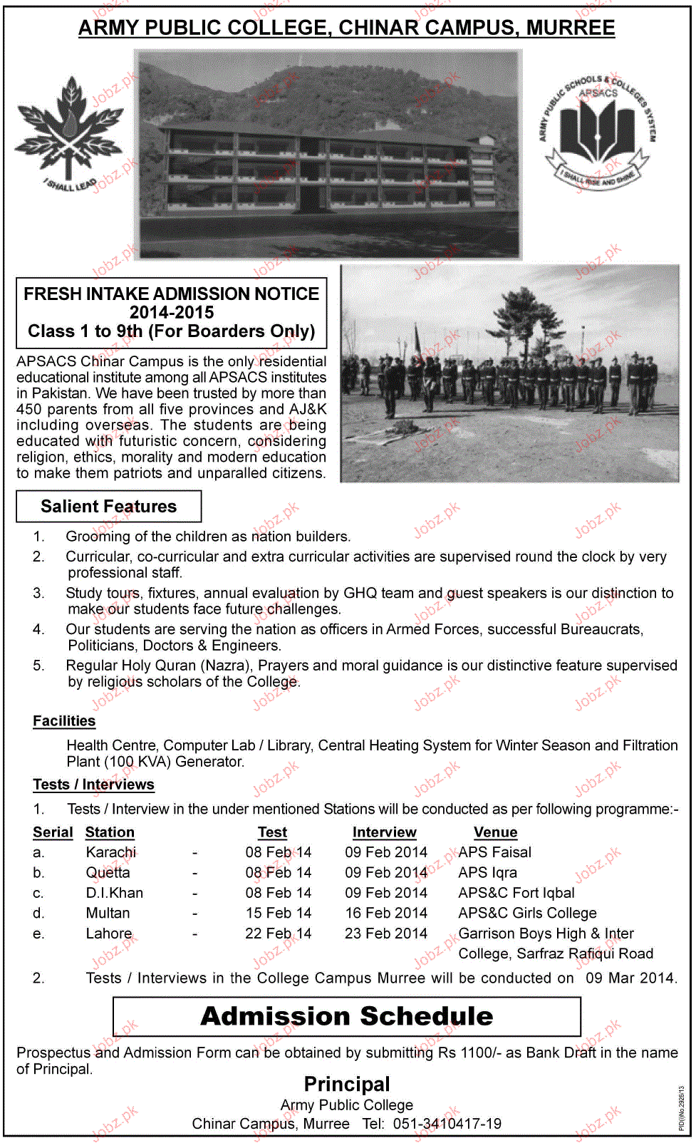 Army Public College Chinar Campus Murree Admission in Class I to IX in Murree Read newspaper ad for exact details.