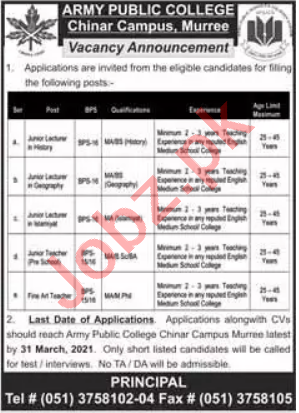 Vacancies in Army Public School & College APS&C Advertisement March 2021
