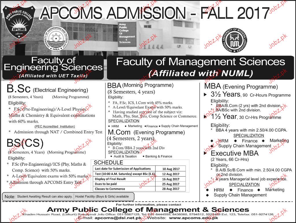 Army Public College of Management Sciences Admission in BSc, BBA, MBA and M.COm in Rawalpindi. Read newspaper ad for exact details.