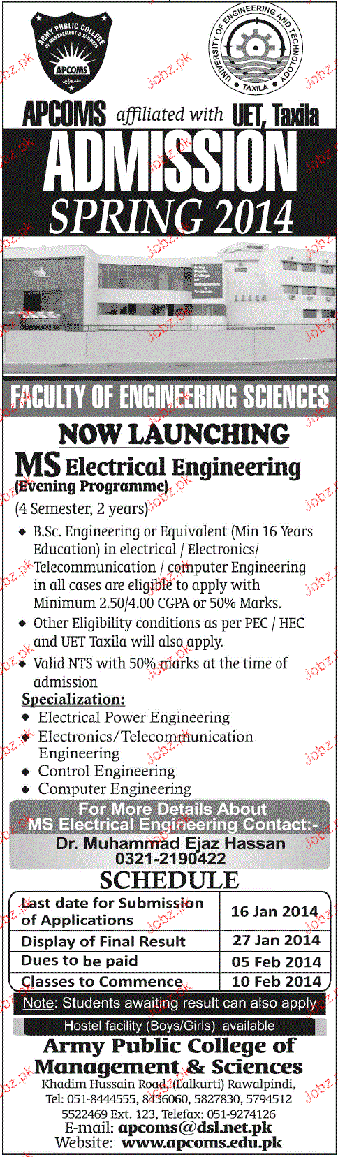 Army Public College of Management & Sciences Admission in MS Electrical Engineering in Rawalpindi Read newspaper ad for exact details.