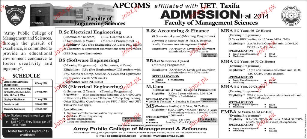 Army Public College of Management & Sciences Admission in B.Tech, BSc, BS, MSc, MCs, BBA, MBA and B.Ed in Rawalpindi. Read newspaper ad for exact details.