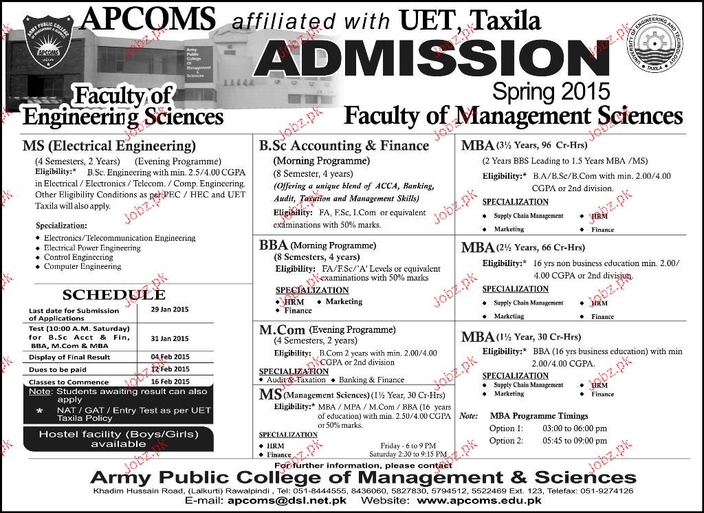 Army Public College of Management & Sciences Admission in MS, BSc, BBA, M.Com and MBA in Rawalpindi. Read newspaper ad for exact details.