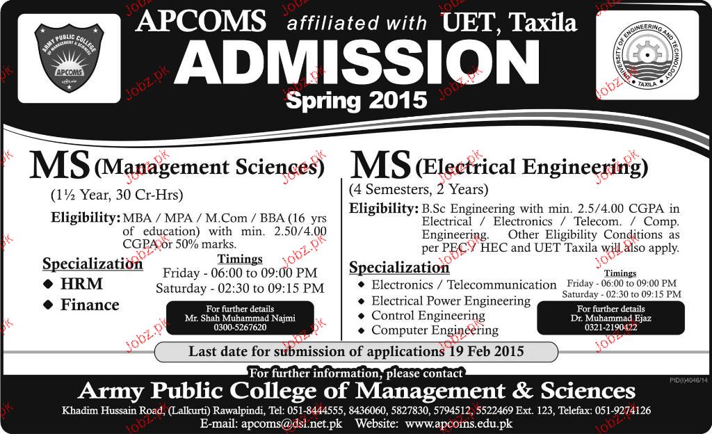 Army Public College of Management & Sciences Admission in MS in Rawalpindi. Read newspaper ad for exact details.