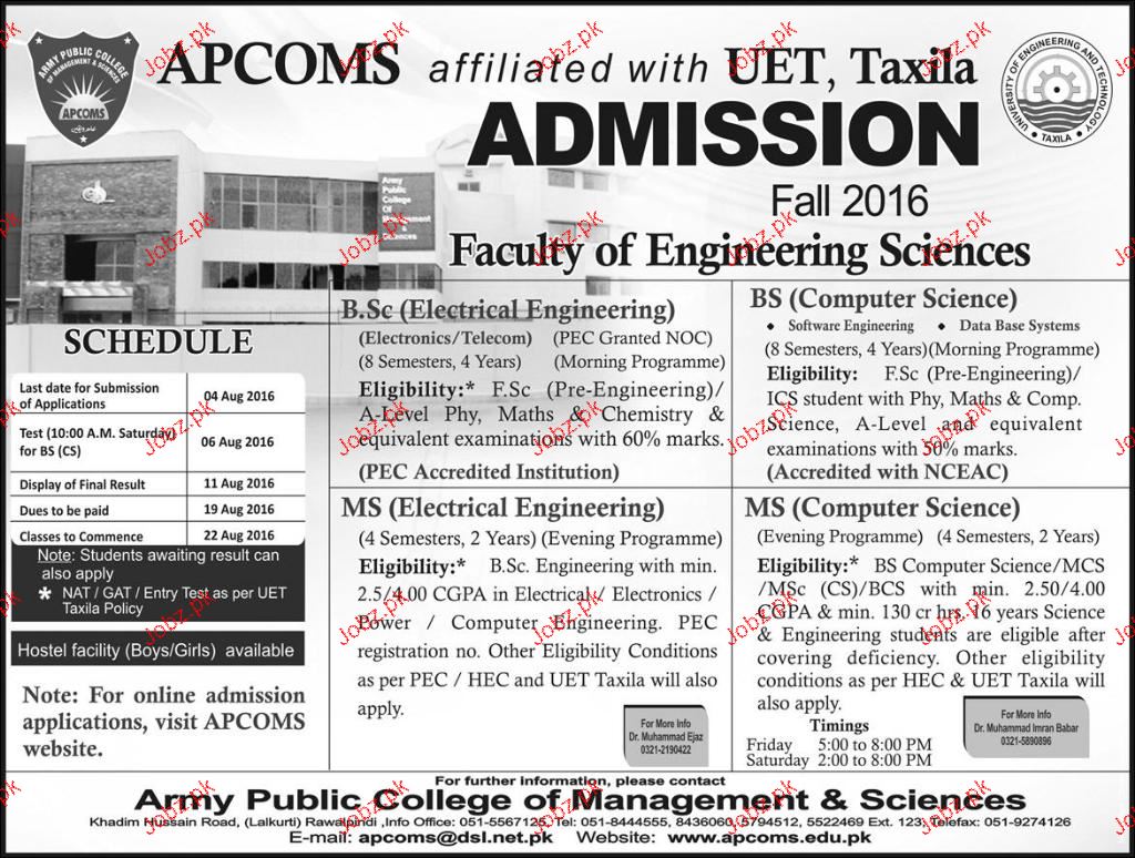 Army Public College of Management Sciences Admission in BSc and MS in Rawalpindi. Read newspaper ad for exact details.