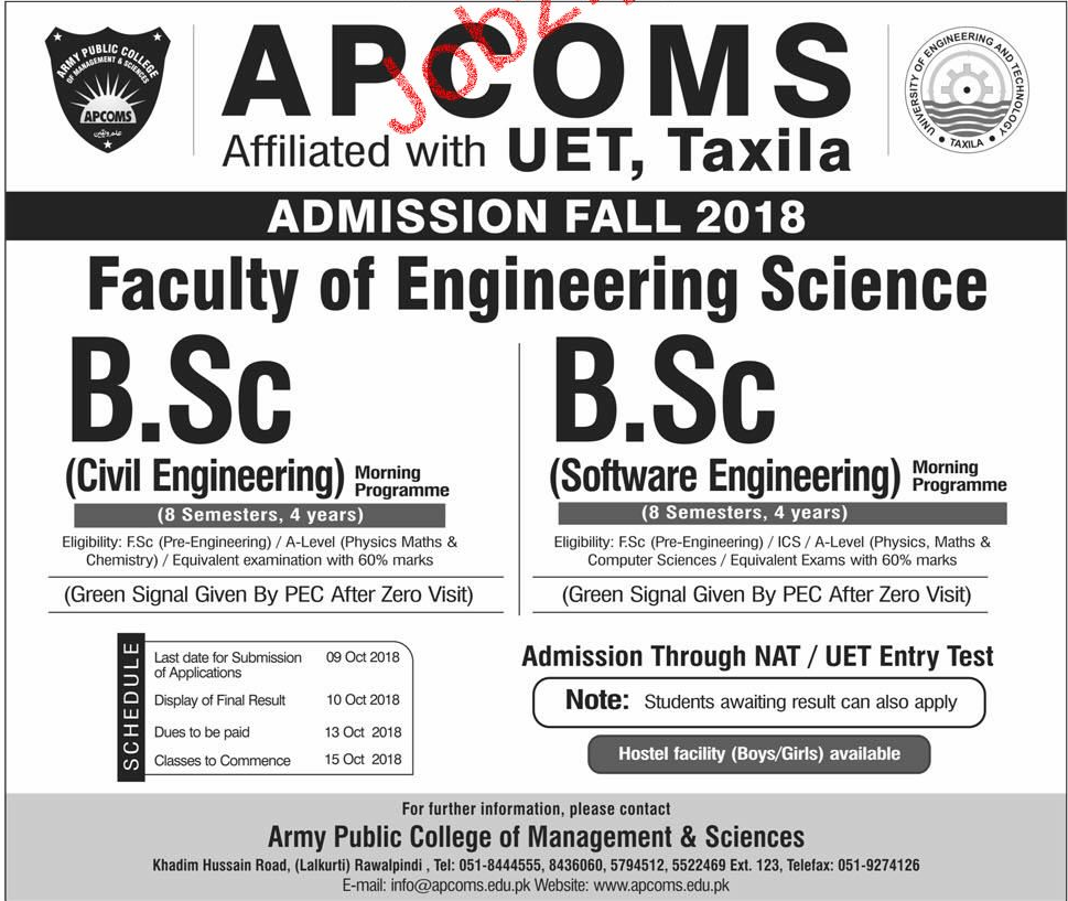 Army Public College of Management & Sciences Admission in Bsc Civil Engineering Morning Programme and BSc Software Engineering Morning Program in Rawalpindi. Read newspaper ad for exact details.