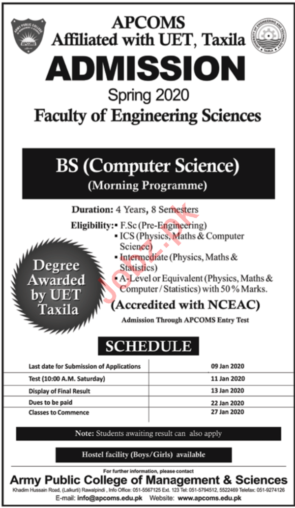 Army Public College of Management & Sciences APCOMS affiliated with University of Engineering & Technology UET is offering admissions for BS Computer Science in Taxila. Read newspaper ad for exact details.