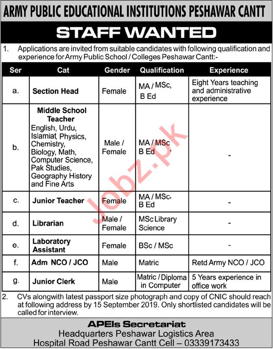 Army Public Educational Institutions is seeking applications from highly qualified and experienced candidates for the positions of English Teacher, Urdu Teacher, Islamiat Teacher, Physics Teacher, Chemistry Teacher, Biology Teacher, Math Teacher, Computer Science Teacher, Pakistan Studies Teacher, Geography Teacher, History Teacher, Fine Arts Teacher, Subject Teacher, Librarian, Laboratory Assistant, Admin Officer and Junior Clerk in Peshawar Cantt KPK 2019.