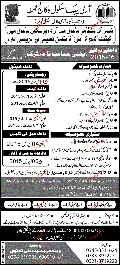 Army Public School and College Admission in Class VI to X in Thatta. Read newspaper ad for exact details.