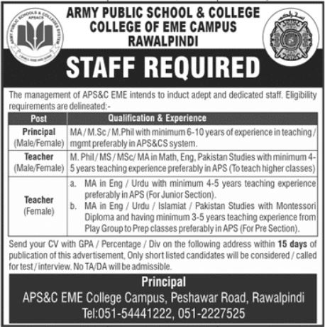 Latest Army Public School & College APS&C Education Posts Rawalpindi 2025